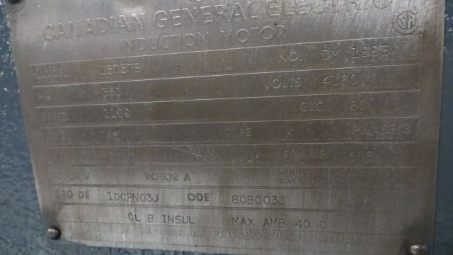 GE Ac Motor, 500 Hp, 1185 Rpm, 4000 Volts, 1.15 Service Factor, 589us Frame, Drive End Bearing 100bc03j, Opposite End Bearing 80bc03j, 66 Amp, Cycle 60, Type K, Phase 3, Max Ambient Temperature 40 C, Rebuilt Storeroom Spare