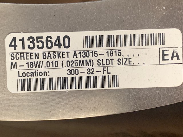 New Storeroom Spare slotted basket for pressure screen M-18; slot size 0.10″/0.025mm; stainless steel