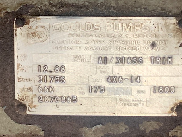 Goulds pump model 3175 size 4x6x14, material 316SS trim, 660 gpm, 1800 rpm, 175 ft HD, Packing, 2/4 vane open impeller, diameter 12.88″