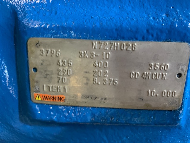 Goulds Self Priming Pump model 3796 size 3x3x10 stainless steel, 435gpm, 400 ft HD, 3560rpm, 8,375″impeller diameter