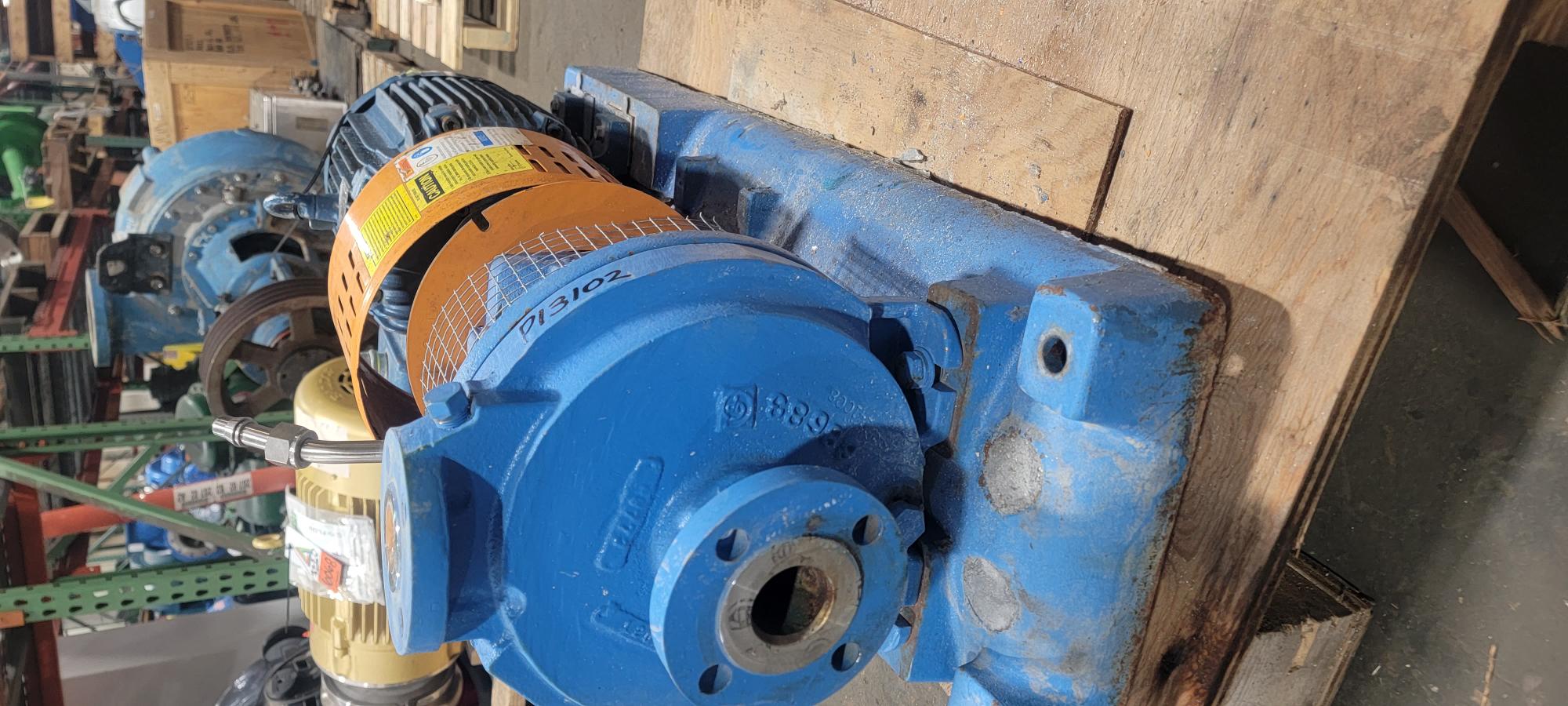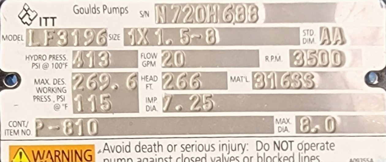 Goulds model LF 3196 Low Flow pump size 1×1.5×8, material 316SS, 20 gpm, 266 ft, 3500 rpm,impeller diameter 7.25″; S/N N720H688; with base and motor