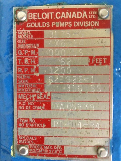 Goulds model 3175 size 4×6-14 ,material 316ss, 5-vane open impeller, used condition