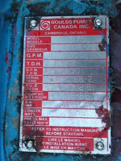 Goulds pump model 3175L, size 18x18x22, material 316ss, 6 vane open impeller, mechanical seal