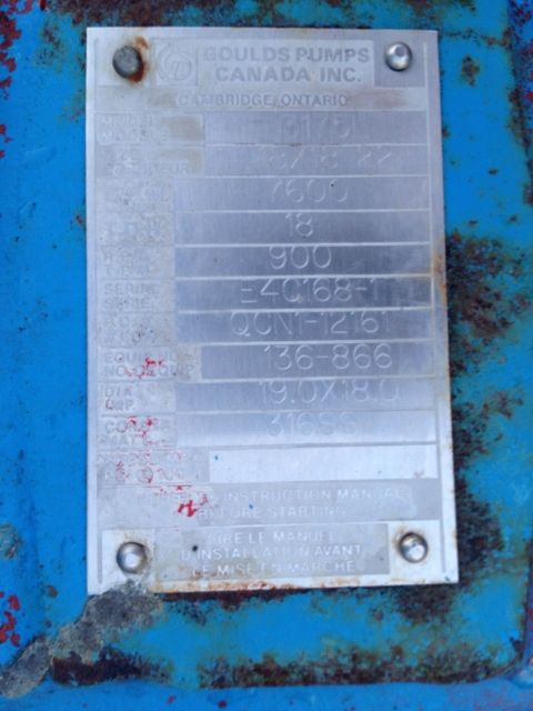 Goulds pump model 3175L, size 18x18x22, material 316ss, 6 vane open impeller, mechanical seal