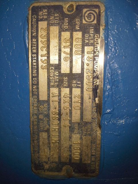 Description: Manufacture: Goulds Model: 3175 Size: 4x6-14 Material: 316 StainlessGoulds Fan Pump model 3420 size 30×30-31 material Ni-Resist / 316ss
