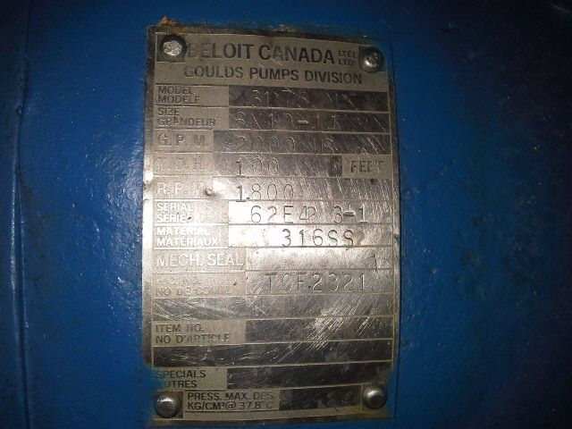 Goulds 3175 size 8x10x14 material 316ss, used condition, 2000 gpm, 100 ft HD, 1800 rpm