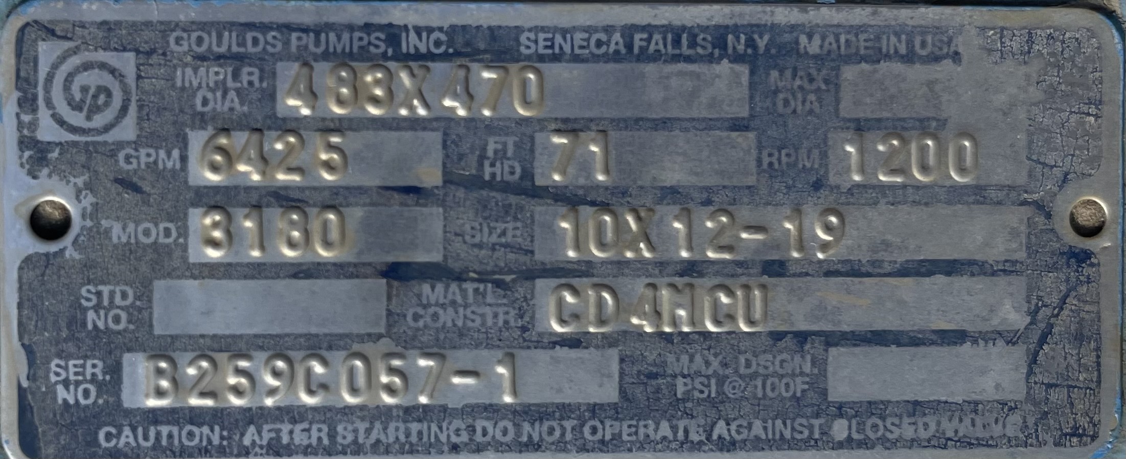 Goulds 3180L pump 10x12x19, CD4MCU material, 6425gpm, 71ft hd, 1200rpm, 483×470 impeller diameter