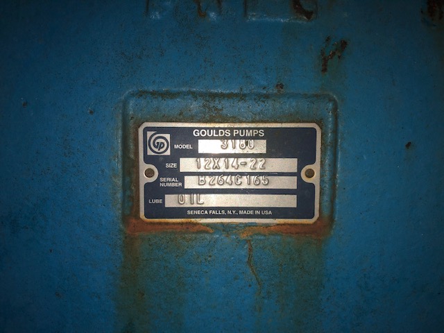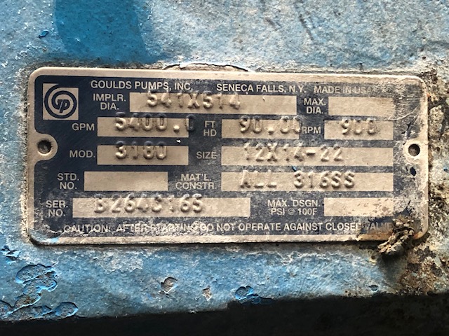 Goulds 3180 12x14x22 stainless steel pump, 541×514 mm Impeller Diameter, 5400 gpm, 90 ft HD, 900 rpm; S/N B264C165