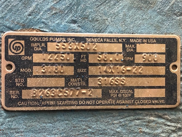 Goulds 3180 14x16x22 stainless steel pump, 553×502 mm Impeller Diameter, 12250 gpm, 58 ft HD, 900 rpm; S/N B263C577-2