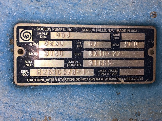 Goulds 3180 8x10x22 stainless steel pump, 568mm Impeller Diameter, 3250 gpm, 87 ft HD, 900 rpm; S/N B263C578-1