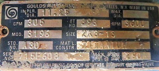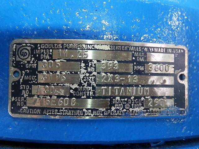 Goulds 3196 pump LTX size 2x3x13, material Titanium, impeller diameter 11.25″, 305gpm, 398 ft HD, 3600rpm, 290 psi