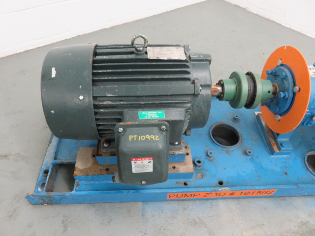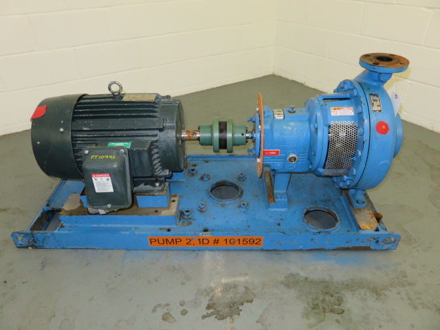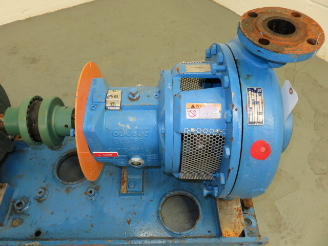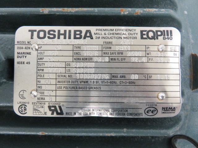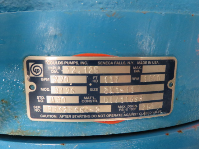 New surplus Goulds pump model 3196MTi size 2x3x13, material DI/316ss, capacity 270gpm, 137ftHD, 1800rpm, impeller diameter 12.125″, 250 psi@100F; with base, and Toshiba AC motor 20hp, 460v, 1770rpm, frame 256T.