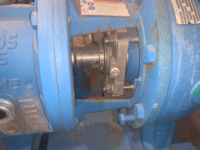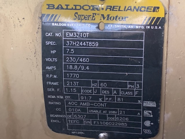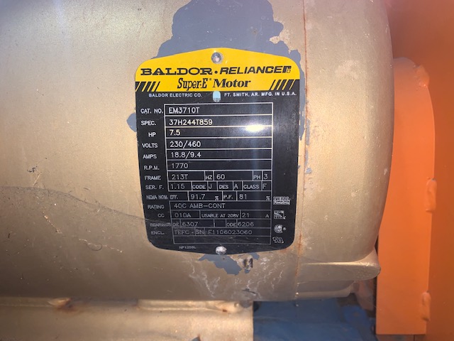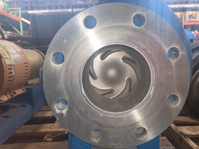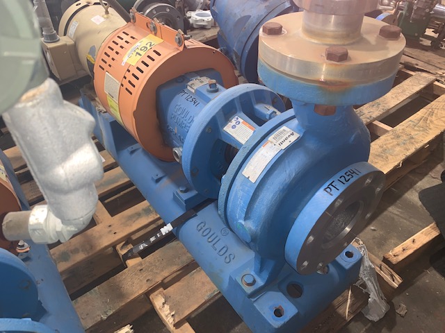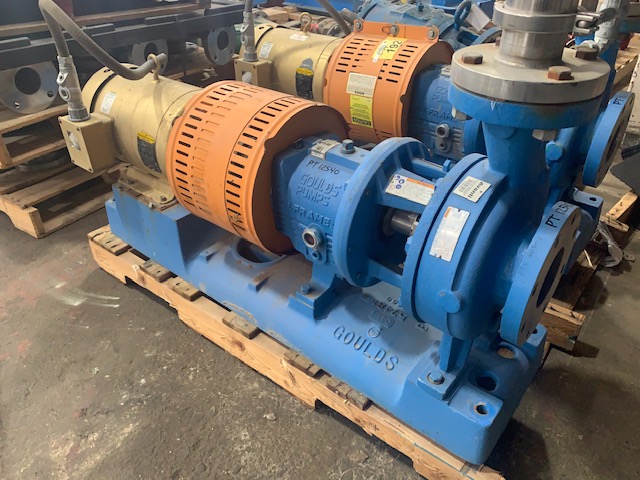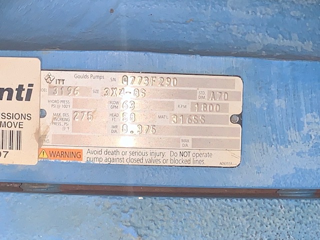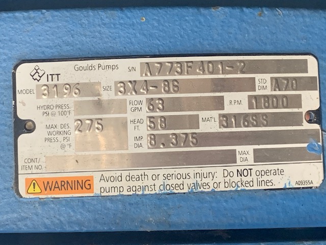 Goulds pump model 3196MTi size 3x4x8G, material CF8M stainless steel, mechanical seal, 63gpm, 58ftHD, 1800rpm, 8.375″ impeller diameter; 275 psi max, Baldor AC motor 7.5hp, 230/460v, 1770rpm, frame 213T; Qty available: 5