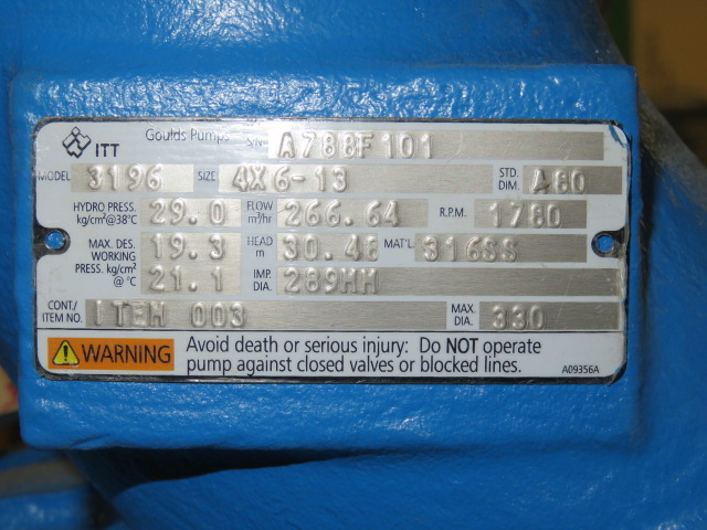 Description: Manufacture: Goulds Model: 3196 MTX Size: 4x6-10H Material: 316ss 1100..Goulds Pump model 3175 size 8×8-12 with base and motor