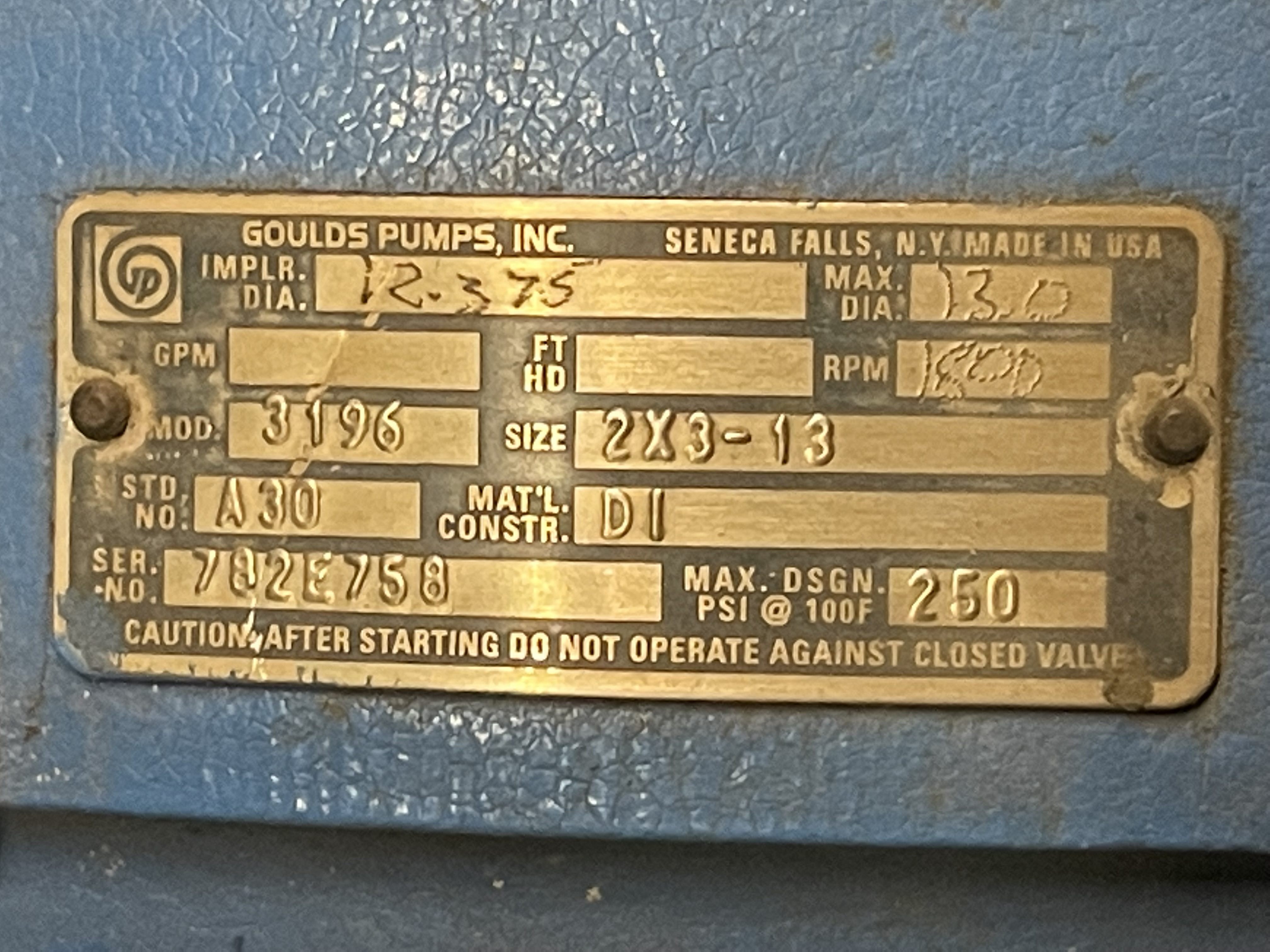 New Storeroom Spare Goulds 3196 MTX size 2x3x13, material DI, Impeller Diameter 12,375″, 1800rpm, 275psi @100F, S/N 782E758