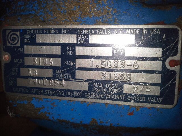 Goulds 3196 STX pump size 1.5x3x6, material 316ss