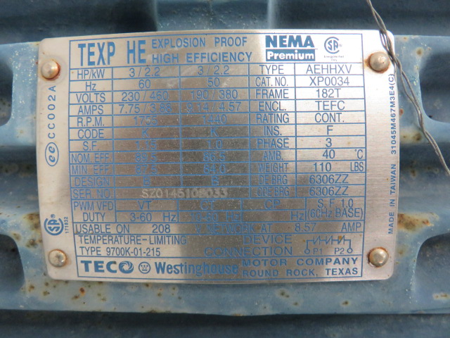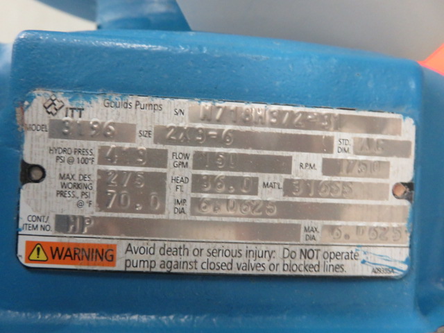 New Surplus Goulds pump model 3196STi size 2x3x6, material 316ss, 150gpm, 1750rpm, 36 ft HD, material 316ss, impeller diameter 6.0625″, 413 psi @ 100F; with Teco Westinghouse AC motor 3hp, 60Hz, 230/460v, 1755rpm, frame 182T