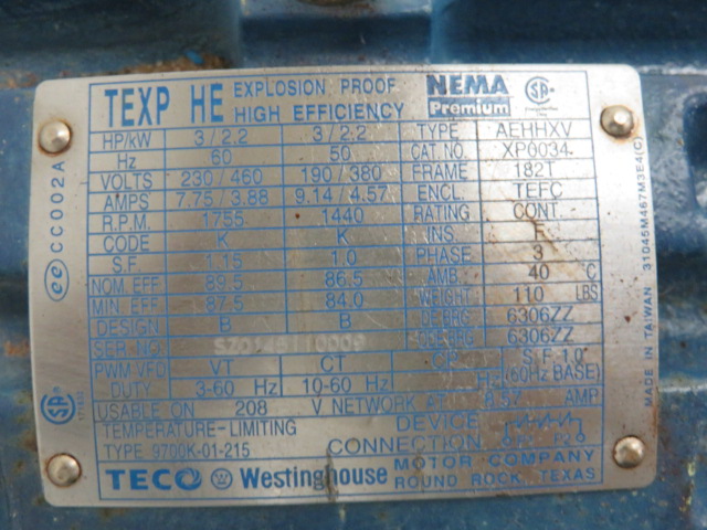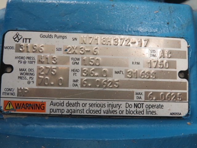 New Surplus Goulds pump model 3196STi size 2x3x6, material 316ss, 150gpm, 1750rpm, 36 ft HD, material 316ss, impeller diameter 6.0625″, 413 psi @ 100F; with Teco Westinghouse AC motor 3hp, 60Hz, 230/460v, 1755rpm, frame 182T