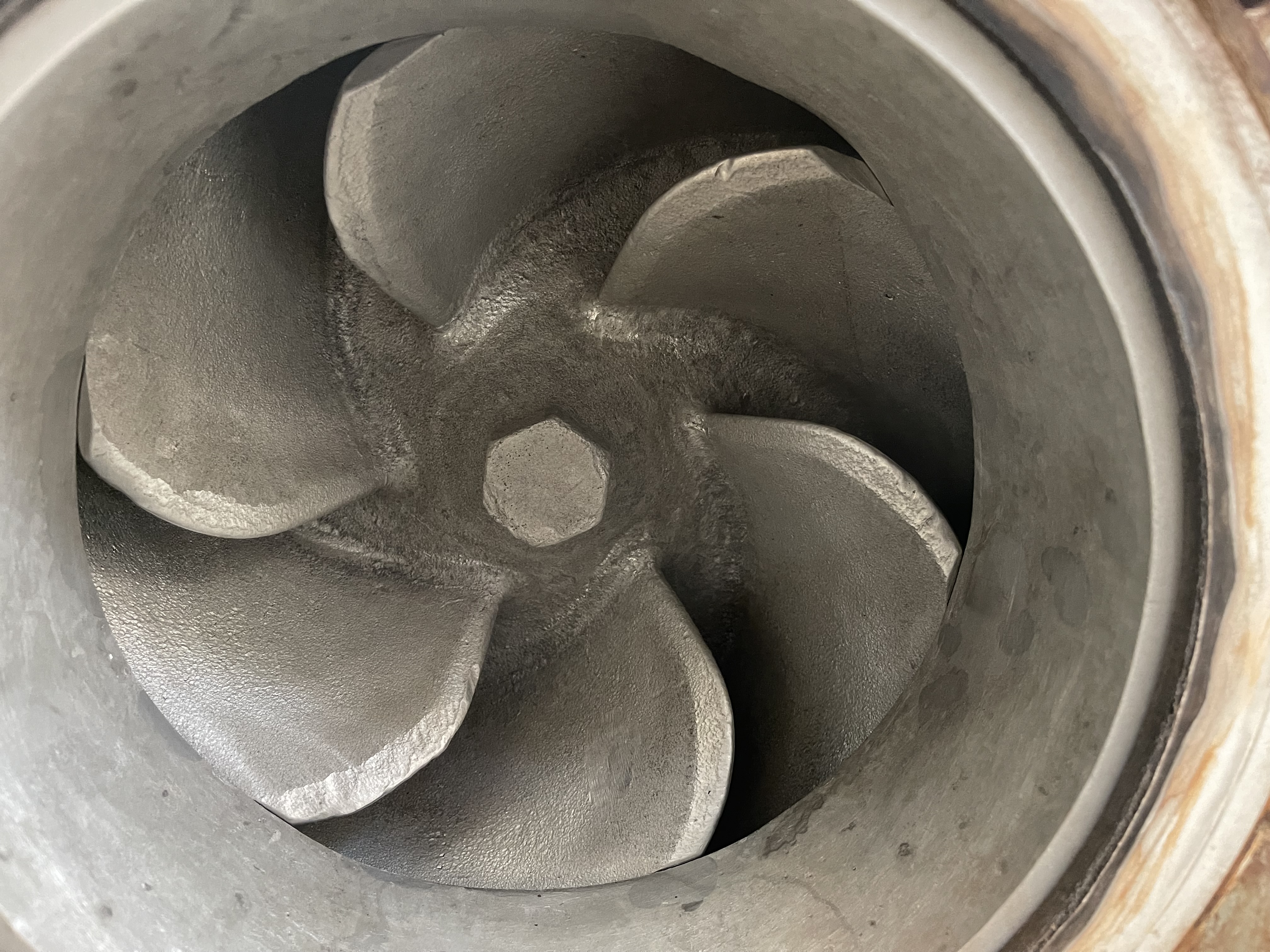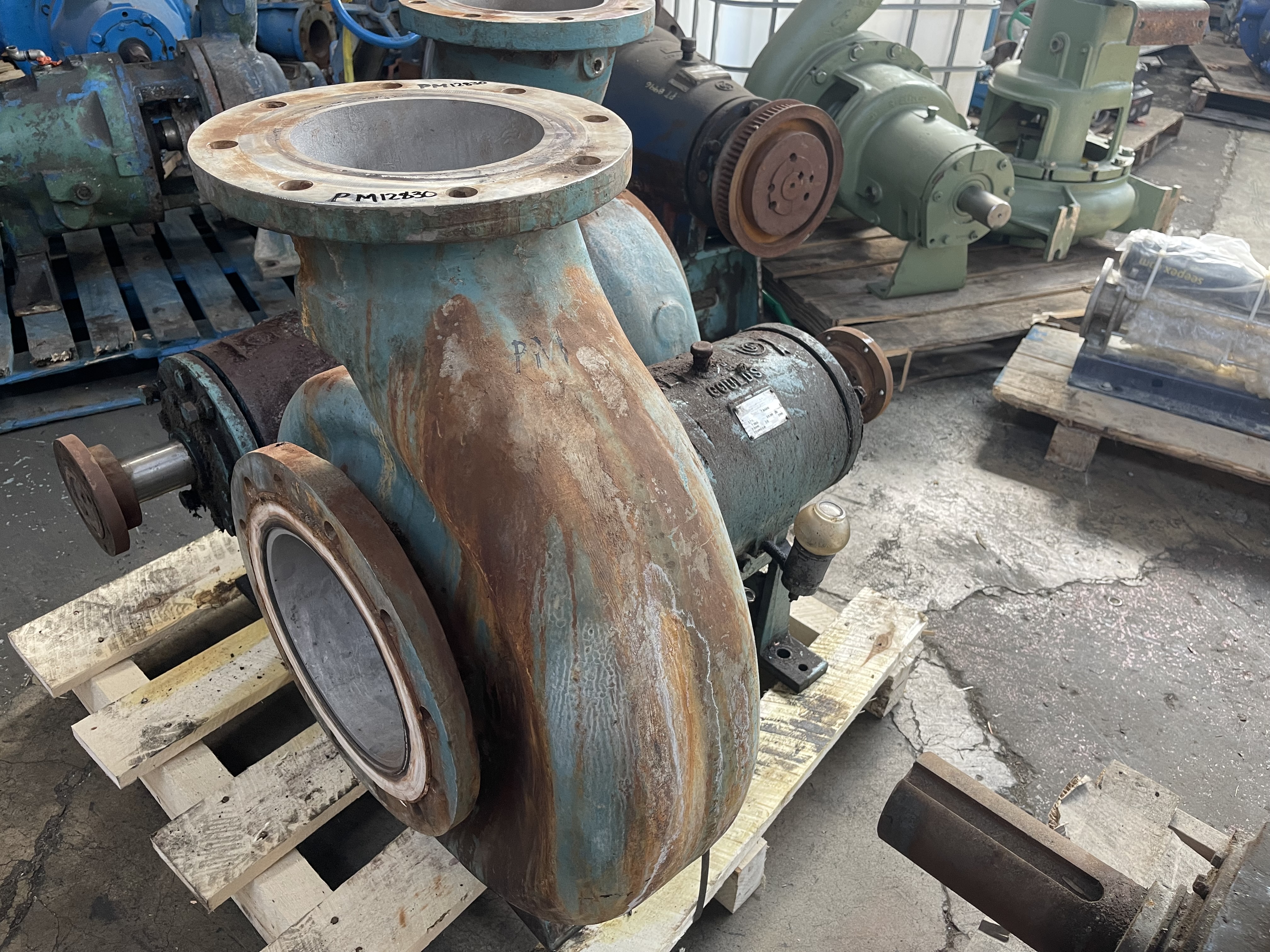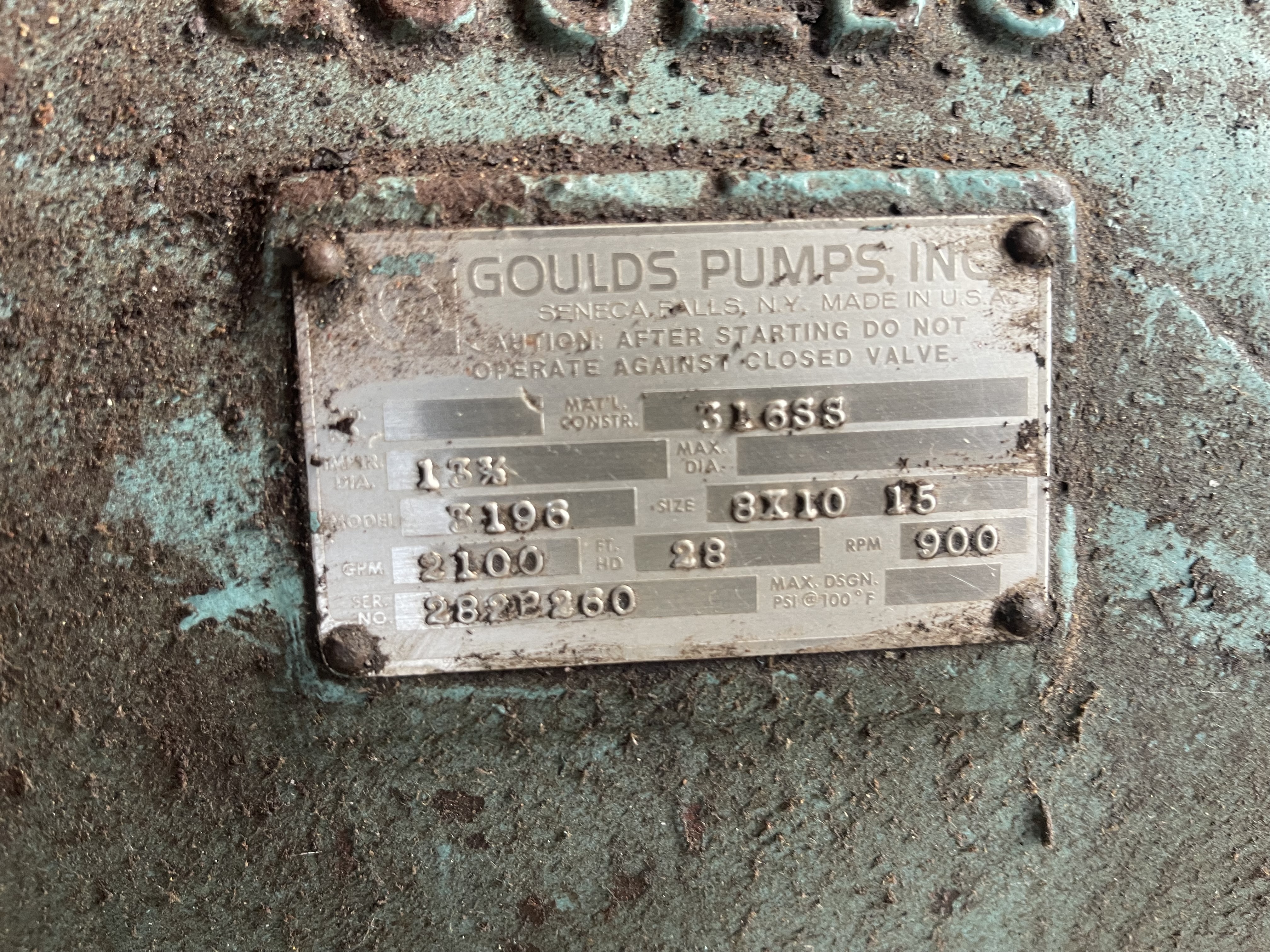 Goulds pump model 3196XLT size 8x10x15, material 316 stainless, 13-1/4″ impeller diameter; 2100 gpm, 28 ft HD, 900 rpm, S/N 282B260