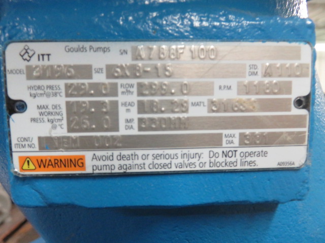 Unused Condition Goulds 3196XLTi pump size 6x8x15, material 316ss, 299m3/h; 1180rpm, 18.29m Head; 330mm impeller diameter; mechanical seal; with base NO Motor!