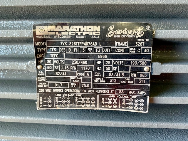 - Marathon AC Motor 30hp, 1170rpm, 230/460v
