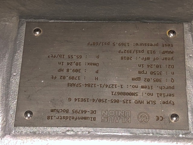 Klaus Union SLM HVO 125-065-250/4-19E14 G Carboxylator Feed Pump, New Storeroom Spare