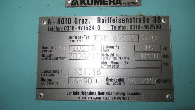 Kumera Gear Drive, Unused Storeroom Spare, Power 15 Kw, 1200 Rpm, Gear Ratio 101.16, Oil Ca 90 L, Viscosity Vg 220 Cst/40 C