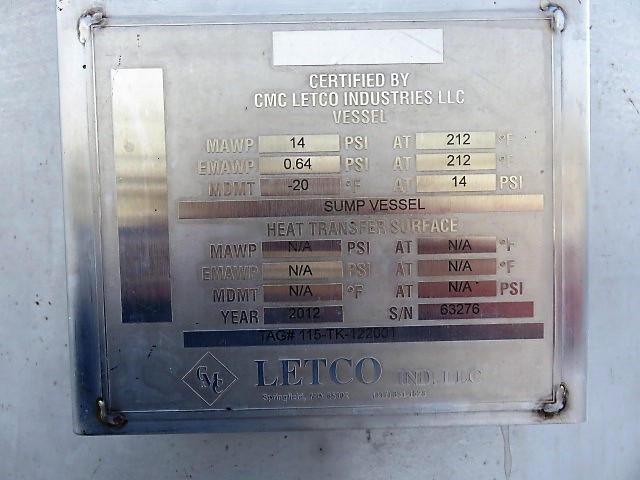 Used-Mason Steel Tank, Approximately 2,500 Gallons, Stainless Steel, Vertical. Approximate 96″ diameter x 74″ straight side, dished top & bottom. Internal rated 14.9 psi at ambient temperature. Off center top entering Lightnin agitator, model 73-C-5, serial# 79073421, ratio 31.3, output rpm 56. Approximate 2-1/2″ diameter shaft with a 4 blade turbine, driven by a 5hp, 3/60/230/460 volt, 1740 rpm motor. (3) 48″ Tall side wall baffles. Openings top 1-1/2″, 2″, 4″, 10″ 18″ man way with cover, 3″ center bottom outlet. Mounts on carbon steel side lugs. Serial# T-4483-9A, built 1980.