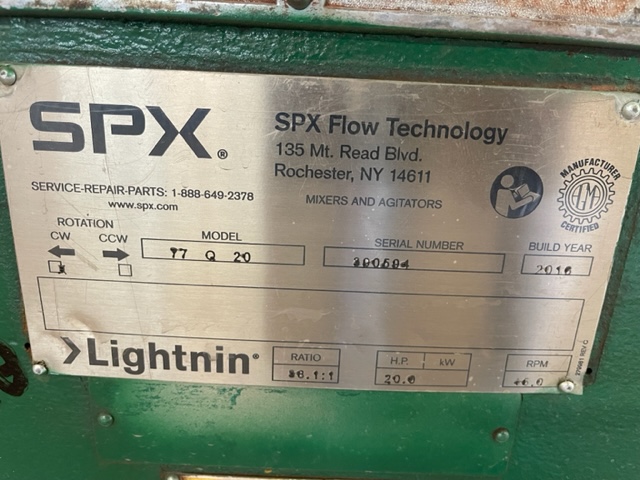 Lightnin Agitator Mixer Model 77Q20, 20hp, year 2016, 46 rpm, ratio 38.1; located in our facility in Ham Lake MN