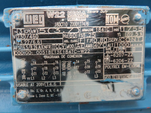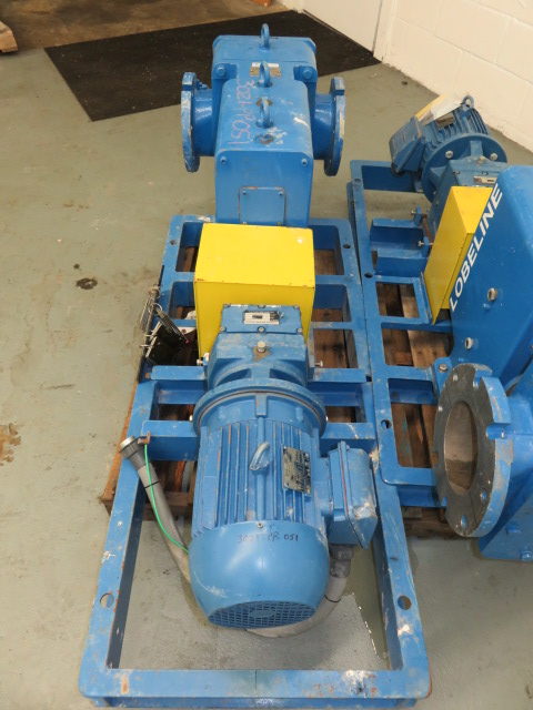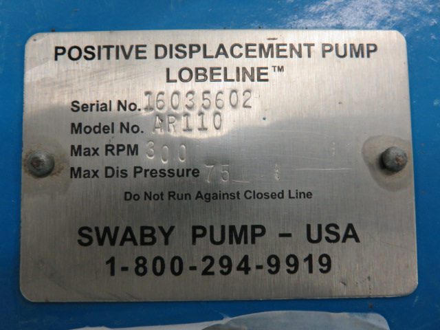 New Surplus Lobeline positive displacement pump model AR110, size 6″, material 316ss, with base and WEG motor 5hp, 1755rpm, 230/460v, frame 184TC