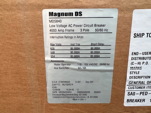 New in Box Eaton MDS840 Magnum DS 4000 Amp Frame Low Voltage AC Power Circuit Breaker