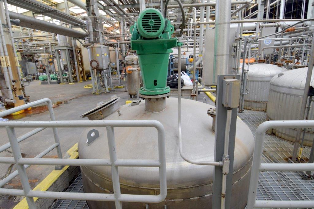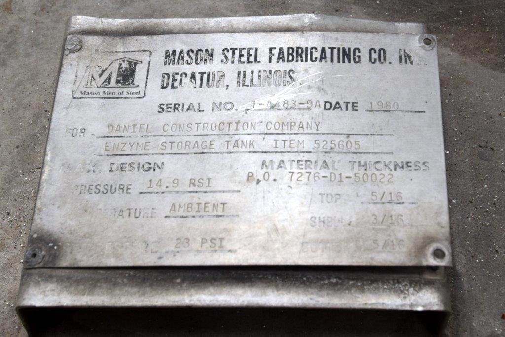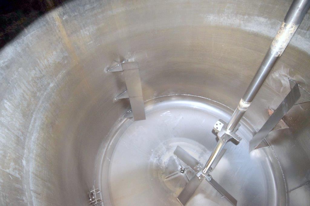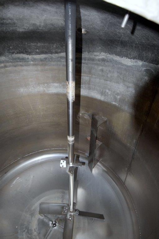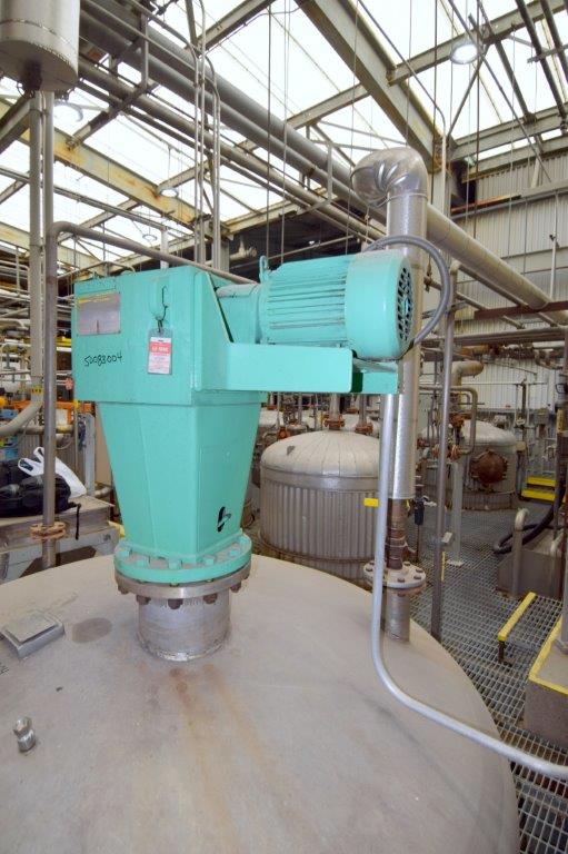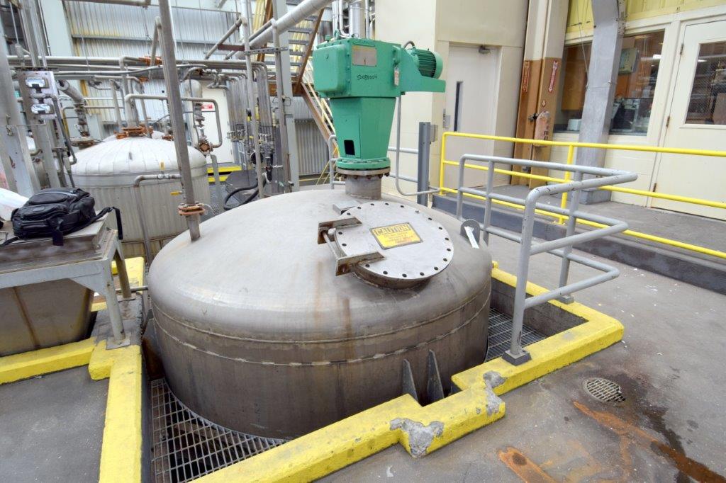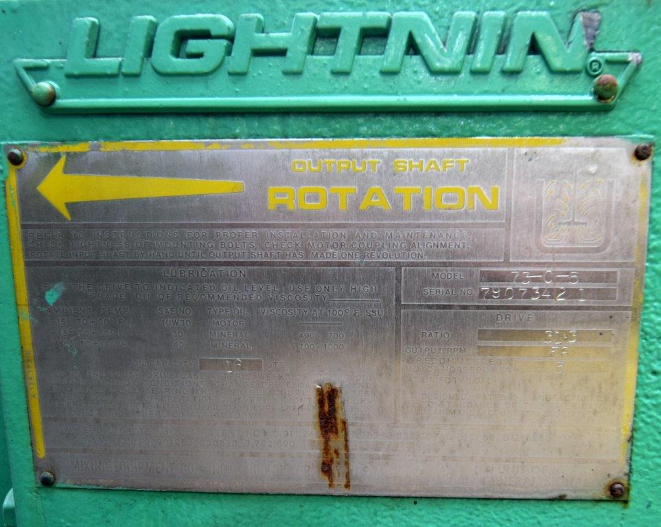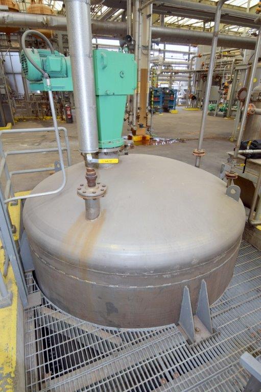 Used-Mason Steel Tank, Approximately 2,500 Gallons, Stainless Steel, Vertical. Approximate 96″ diameter x 74″ straight side, dished top & bottom. Internal rated 14.9 psi at ambient temperature. Off center top entering Lightnin agitator, model 73-C-5, serial# 79073421, ratio 31.3, output rpm 56. Approximate 2-1/2″ diameter shaft with a 4 blade turbine, driven by a 5hp, 3/60/230/460 volt, 1740 rpm motor. (3) 48″ Tall side wall baffles. Openings top 1-1/2″, 2″, 4″, 10″ 18″ man way with cover, 3″ center bottom outlet. Mounts on carbon steel side lugs. Serial# T-4483-9A, built 1980.