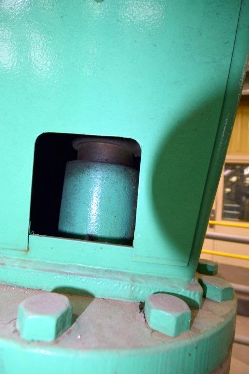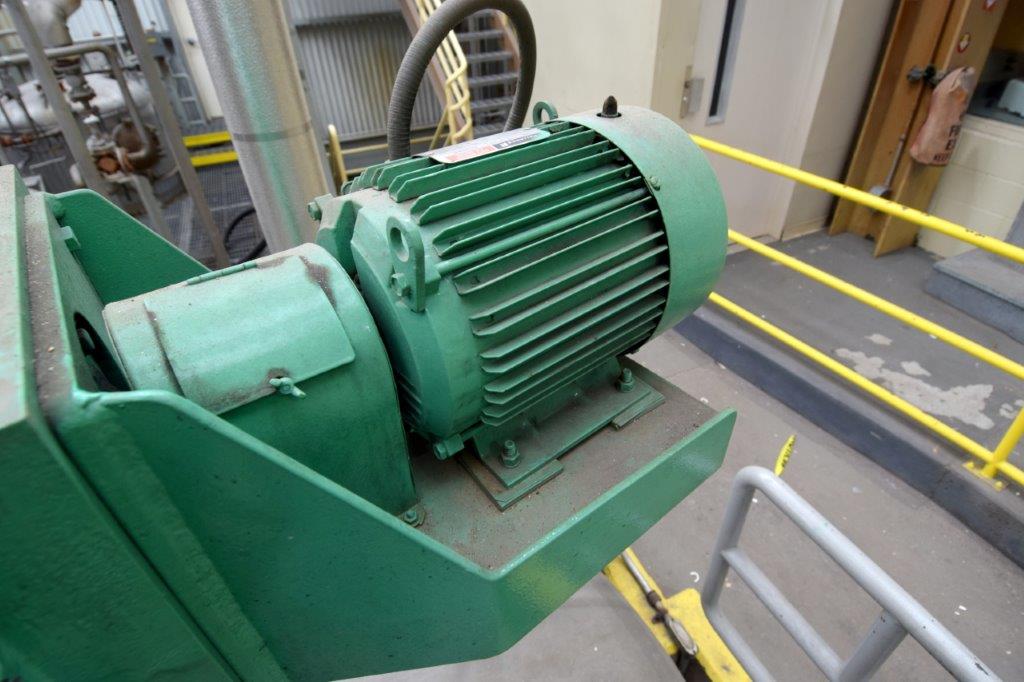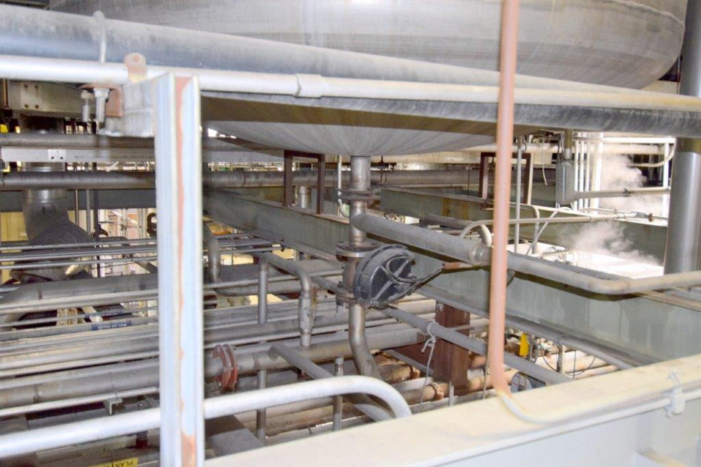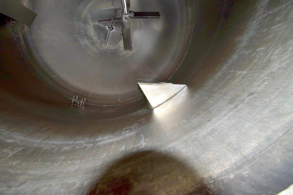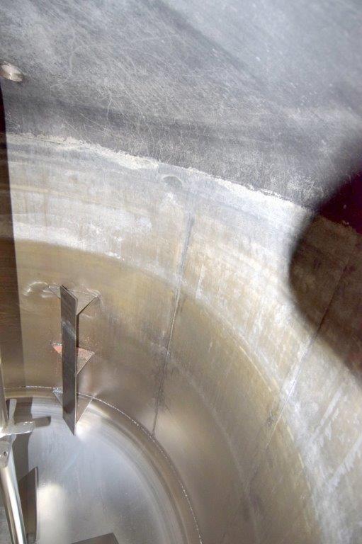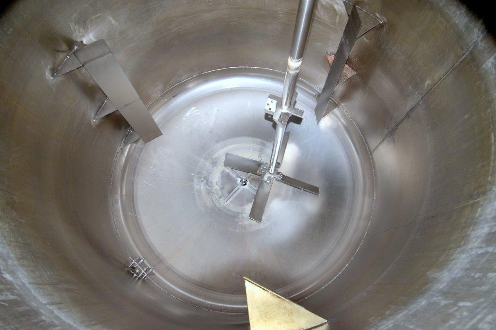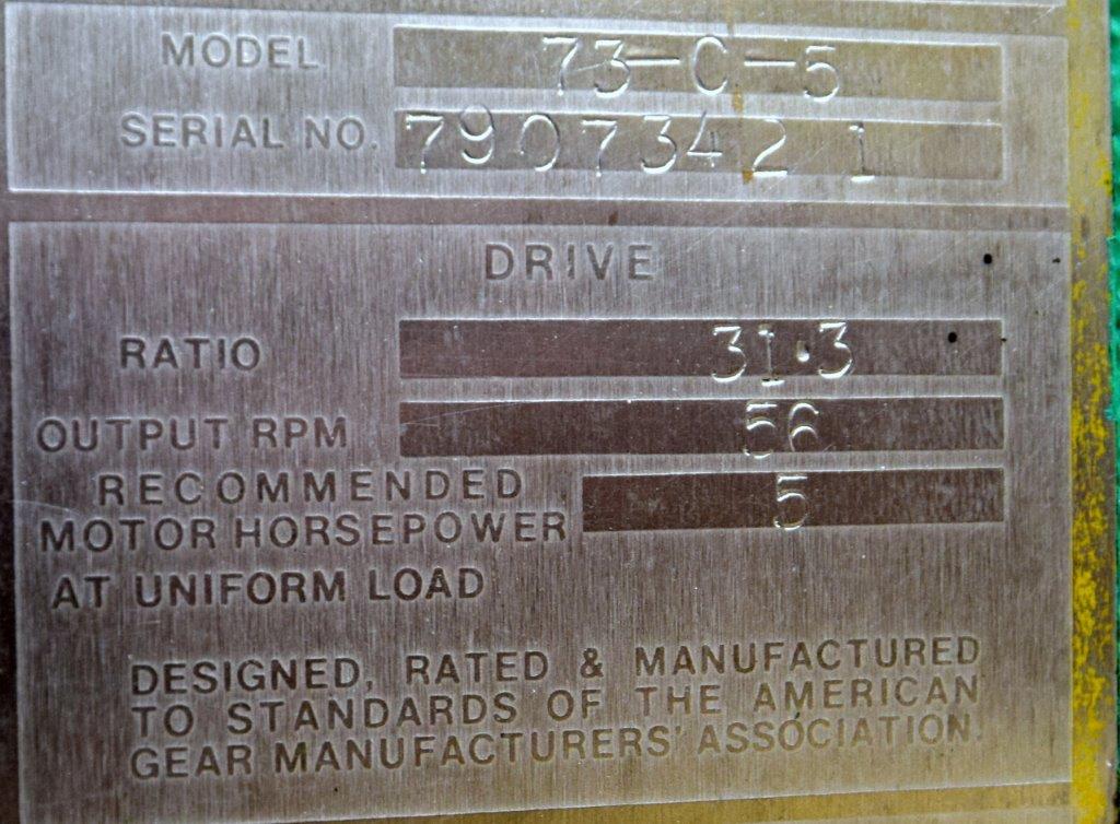 Used-Mason Steel Tank, Approximately 2,500 Gallons, Stainless Steel, Vertical. Approximate 96″ diameter x 74″ straight side, dished top & bottom. Internal rated 14.9 psi at ambient temperature. Off center top entering Lightnin agitator, model 73-C-5, serial# 79073421, ratio 31.3, output rpm 56. Approximate 2-1/2″ diameter shaft with a 4 blade turbine, driven by a 5hp, 3/60/230/460 volt, 1740 rpm motor. (3) 48″ Tall side wall baffles. Openings top 1-1/2″, 2″, 4″, 10″ 18″ man way with cover, 3″ center bottom outlet. Mounts on carbon steel side lugs. Serial# T-4483-9A, built 1980.