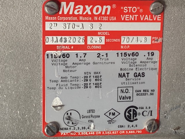 New Surplus Maxon 2″ shut off valve model STO-A S 2, closing 2.5 seconds, s/n 04A432026