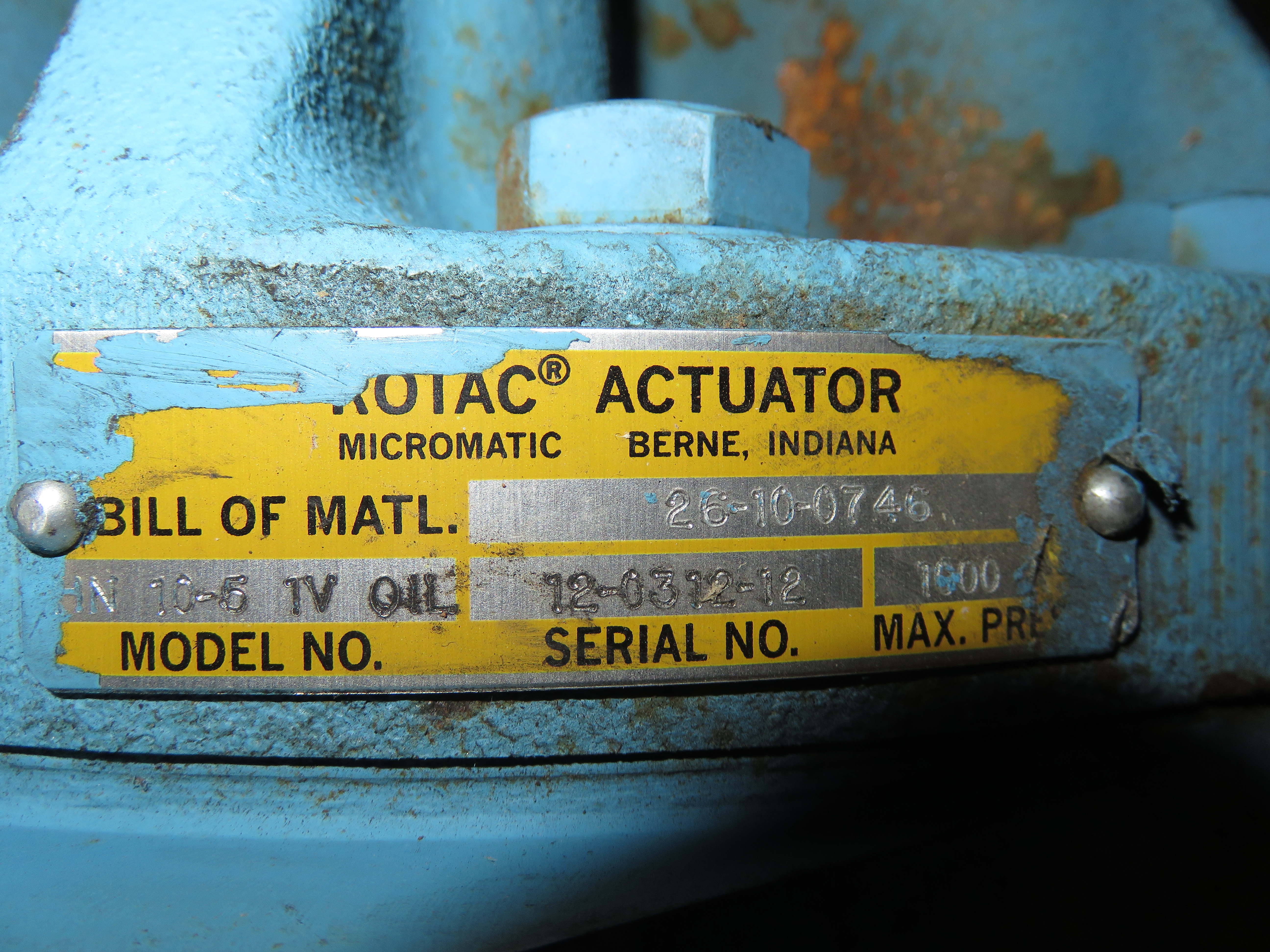 New Surplus Micromatic Rotac Actuator model HN 10-5 1V OIL, Bill of Matl 26-10-0746, serial No. 12-0312-12, Max Press 1000