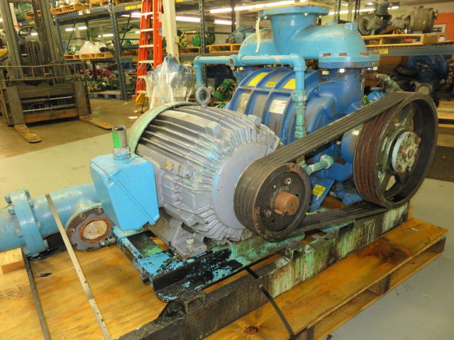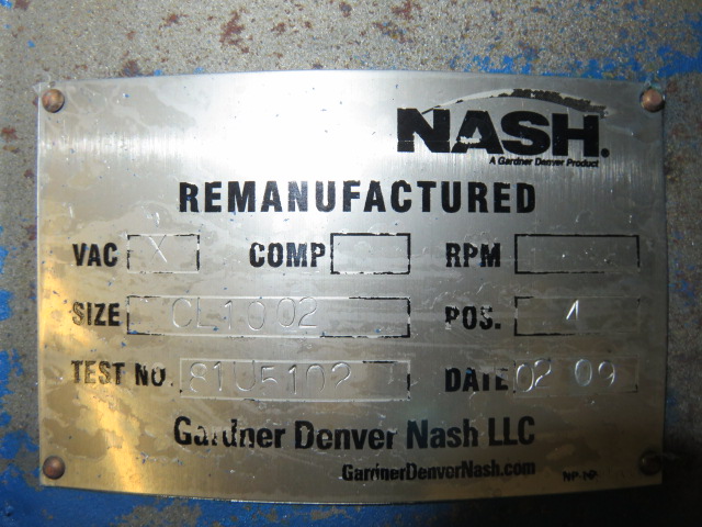 Nash CL1002 vacuum pump with base and motor; Pos. 4, Remanufactured in 2009 by Nash. Test No. 81U5102, with 75hp, 1775 rpm, 230/460v AC motor