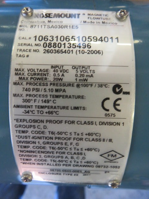 Unused Rosemount 8711TSA030R1E5 Magnetic Flowtube , size 3″