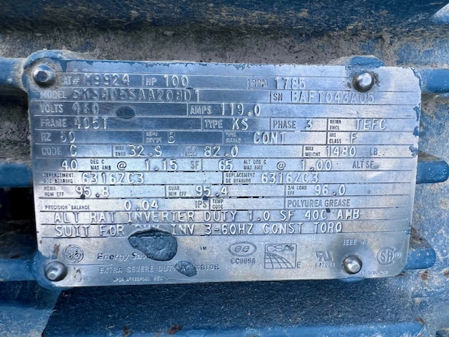- 100 hp, 460v, frame 405T, 1785 rpm AC Motor
