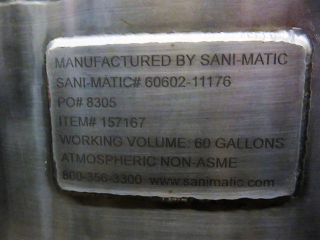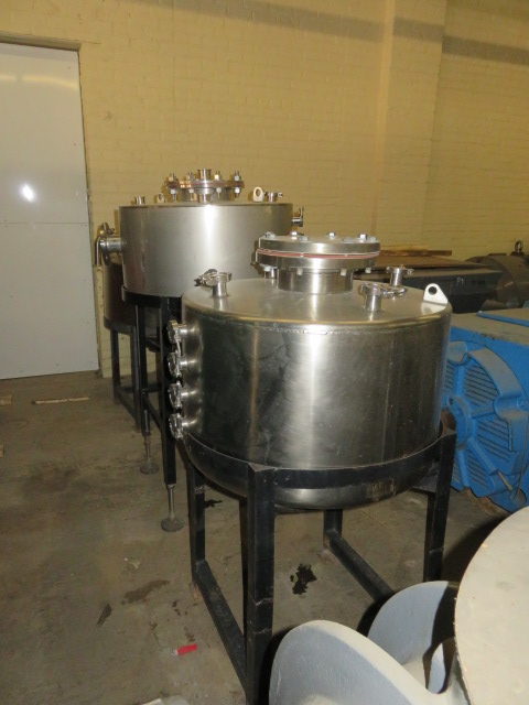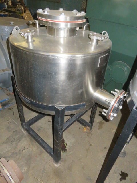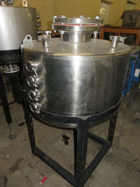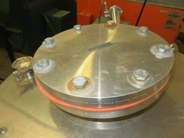 Used-Mason Steel Tank, Approximately 2,500 Gallons, Stainless Steel, Vertical. Approximate 96″ diameter x 74″ straight side, dished top & bottom. Internal rated 14.9 psi at ambient temperature. Off center top entering Lightnin agitator, model 73-C-5, serial# 79073421, ratio 31.3, output rpm 56. Approximate 2-1/2″ diameter shaft with a 4 blade turbine, driven by a 5hp, 3/60/230/460 volt, 1740 rpm motor. (3) 48″ Tall side wall baffles. Openings top 1-1/2″, 2″, 4″, 10″ 18″ man way with cover, 3″ center bottom outlet. Mounts on carbon steel side lugs. Serial# T-4483-9A, built 1980.