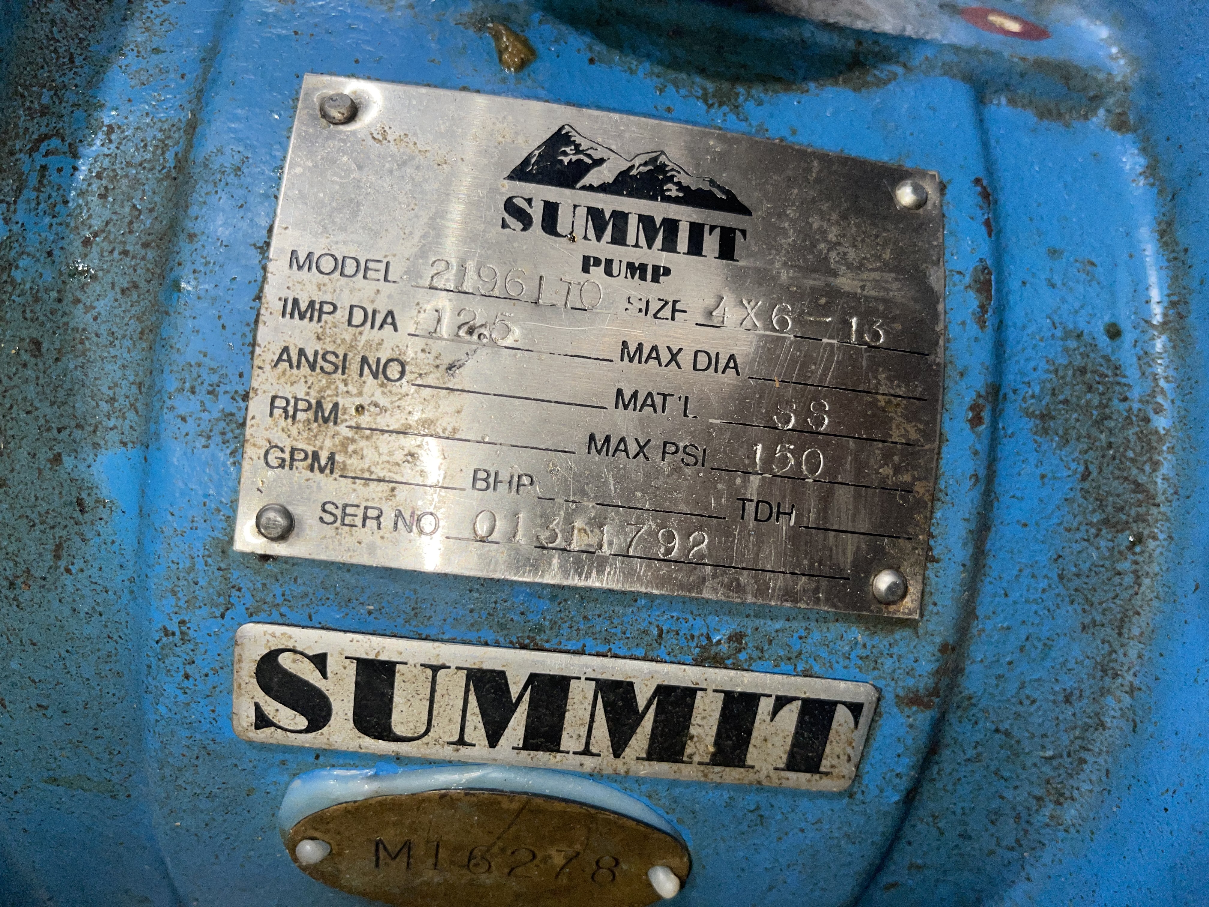 Summit pump model 2196LTO equal Goulds LTX; size 4x6x13, material 316 stainless steel