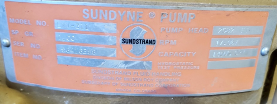 - Manufacture: Sundyne / Sundstrand Fluid Handling Corporation