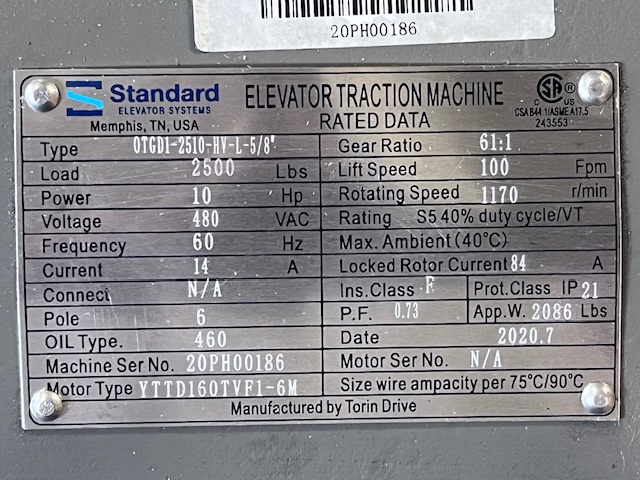New Storeroom Spare Standard TorinDrive 0TG1-2510-HV-L-5/8″ Overhead Elevator Traction Machine