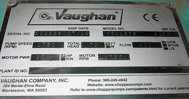 Unused Condition Vaughan pump model HE4L6CS, 8.90″; 70ftHD, 400gpm, 20hp motor, 1750rpnm year 2014. Original Packing!