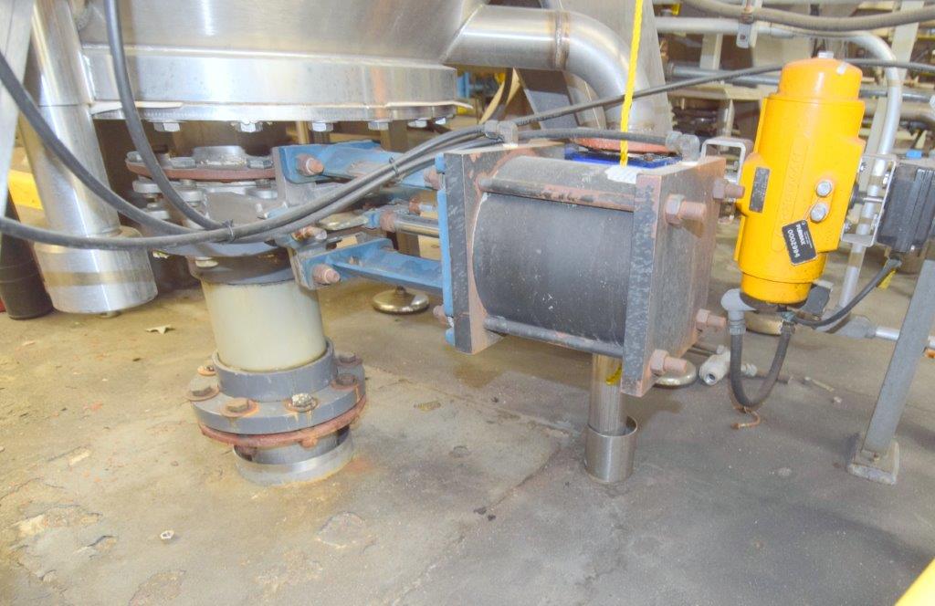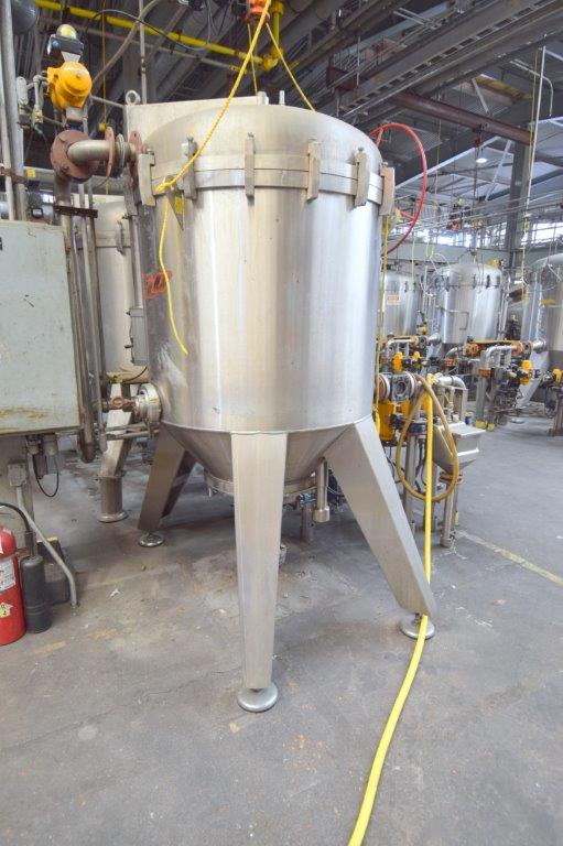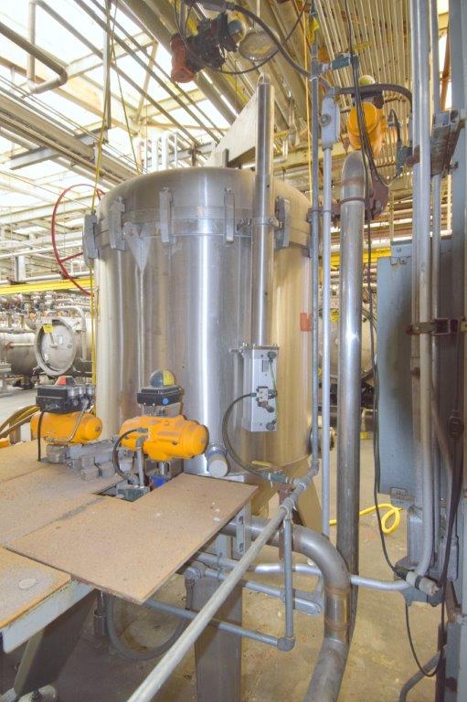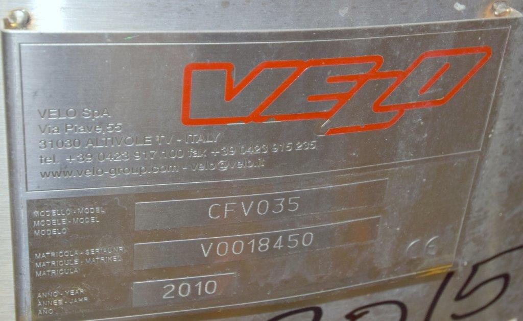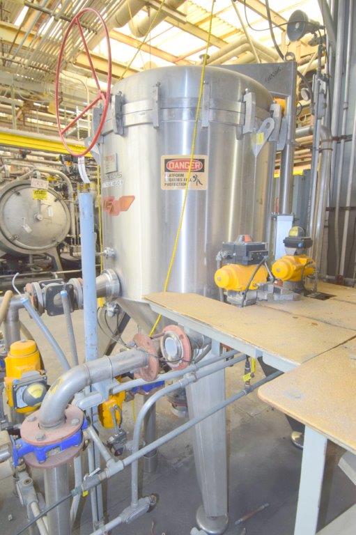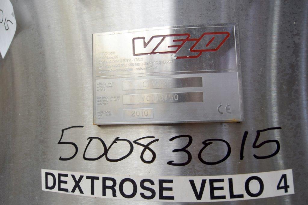 Used- Velo S.P.A. Vertical Leaf & Tank Filter, Model CFV35, Stainless Steel. Tank approximate 48″ diameter x 41″ straight side, dished removable top on davit arm, coned bottom. (18) Vertical filters. Serial# V0018450, built 2010.