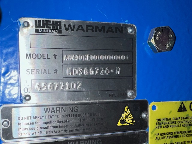 Description: Manufacture: Warman Model: 20AL S/N: MDS20246-M 5HP, 575V, 1745 RPMWarman 8×6 AH Horizontal Slurry Pump, Model 086EAHCCCPW8808, New Storeroom Spare