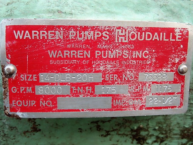 Warren horizontal split casing pump , size 14DBL20H, material 316 stainless, impeller diameter 18 3/4″”, 8000gpm, 175 ft HD, 1175rpm, s/n 75588